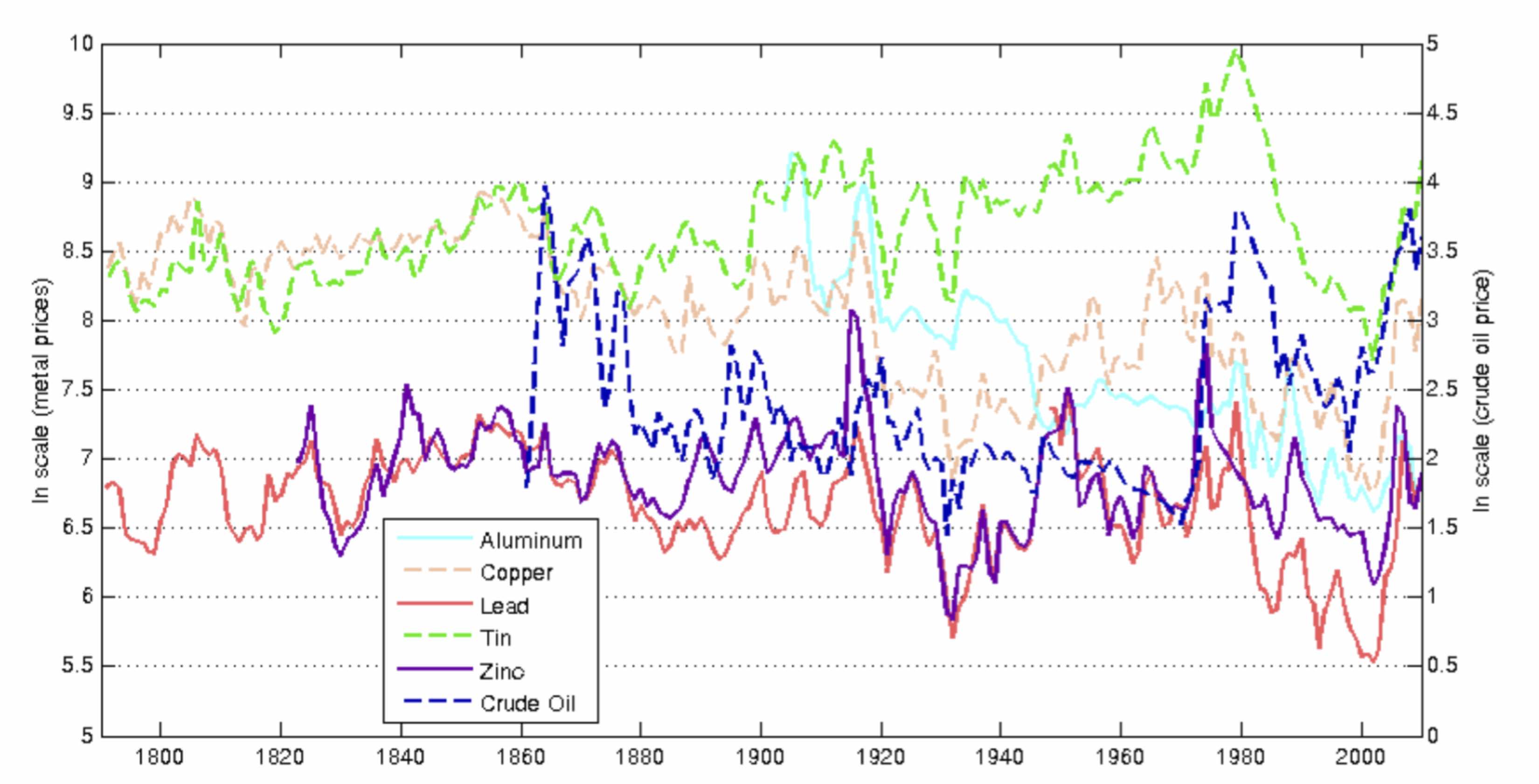 The fact that sets things in motion for Stuermer and Schwerhoff is captured by this plot of resource prices over the last two centuries. Over this period, the quantities of resources extracted each year increased by 2 or 3 orders of magnitude, but prices show no long-run tendency to increase: