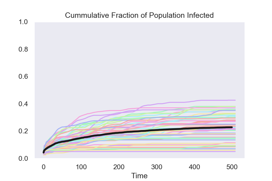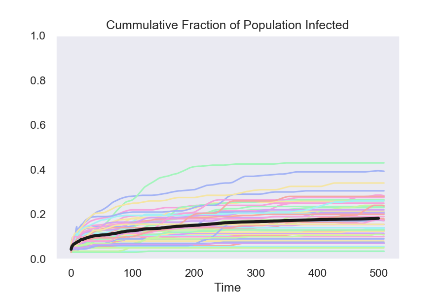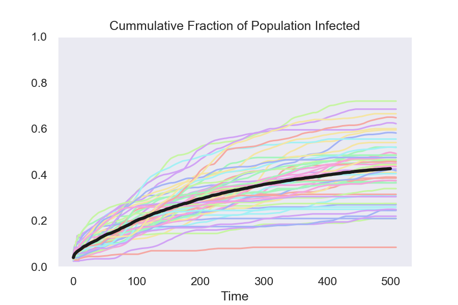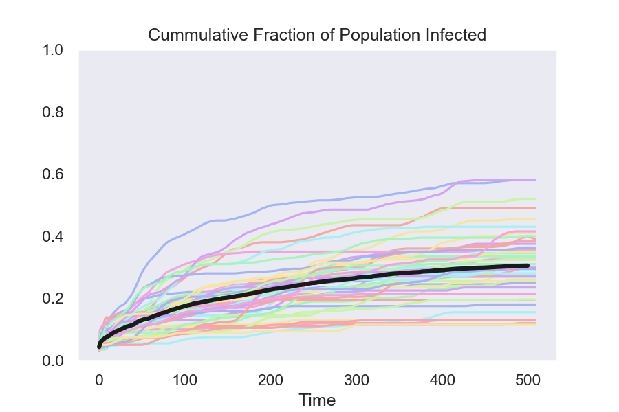 The colored lines in the graphs show the results from 50 runs of the model. The black line is the average at each date of these 50 runs.