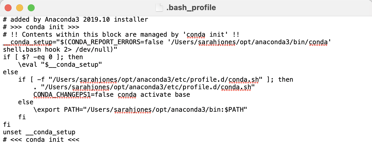 .bash-profileback in 2019. Notice that the Anaconda code is delimited by lines that contain>>> condaand<<< conda. Look for code like this in.bash-profile. Delete the lines between any such delimiters. Because lines that start with the character#are comments, it is harmless to leave them. Leave any other code and save the file where it is, in your Home folder. This may break Anaconda, but it will let the official version of Python run.