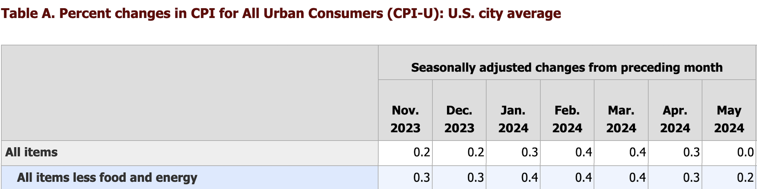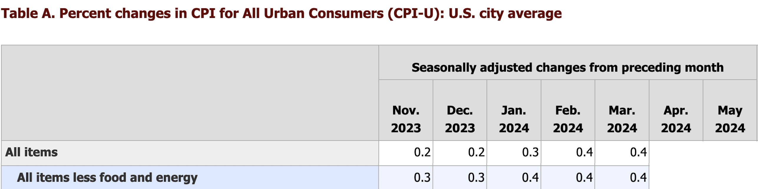It is obvious that they were wrong about the trend. Look at the data from the table again, but this time, I won’t hide the values for Apr and May. (This table is from the BLS report that came out on June 12, 2024. Click to see the original.) As before, ignore the top line with the volatile headline measure of inflation and focus only on the line with data for the CPI minus food and energy: