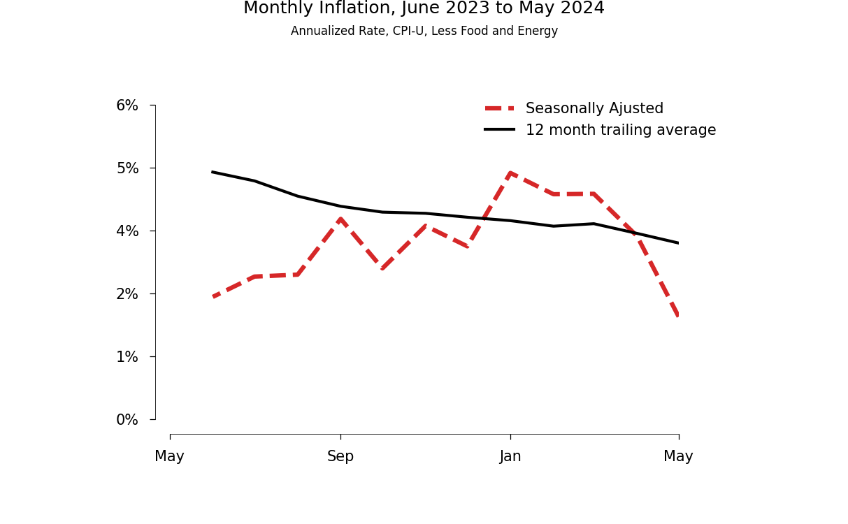 Suppose that on average, over the last 12 months, the trend rate of inflation decreased by about 10 basis points each month. This would mean a reduction over the course of a year of 1.2%, which is substantially less than the actual reduction of 1.8% between the most recent 12-month interval and the previous 12-month interval. But to be fair, some of that reduction could have taken place before June 2023.