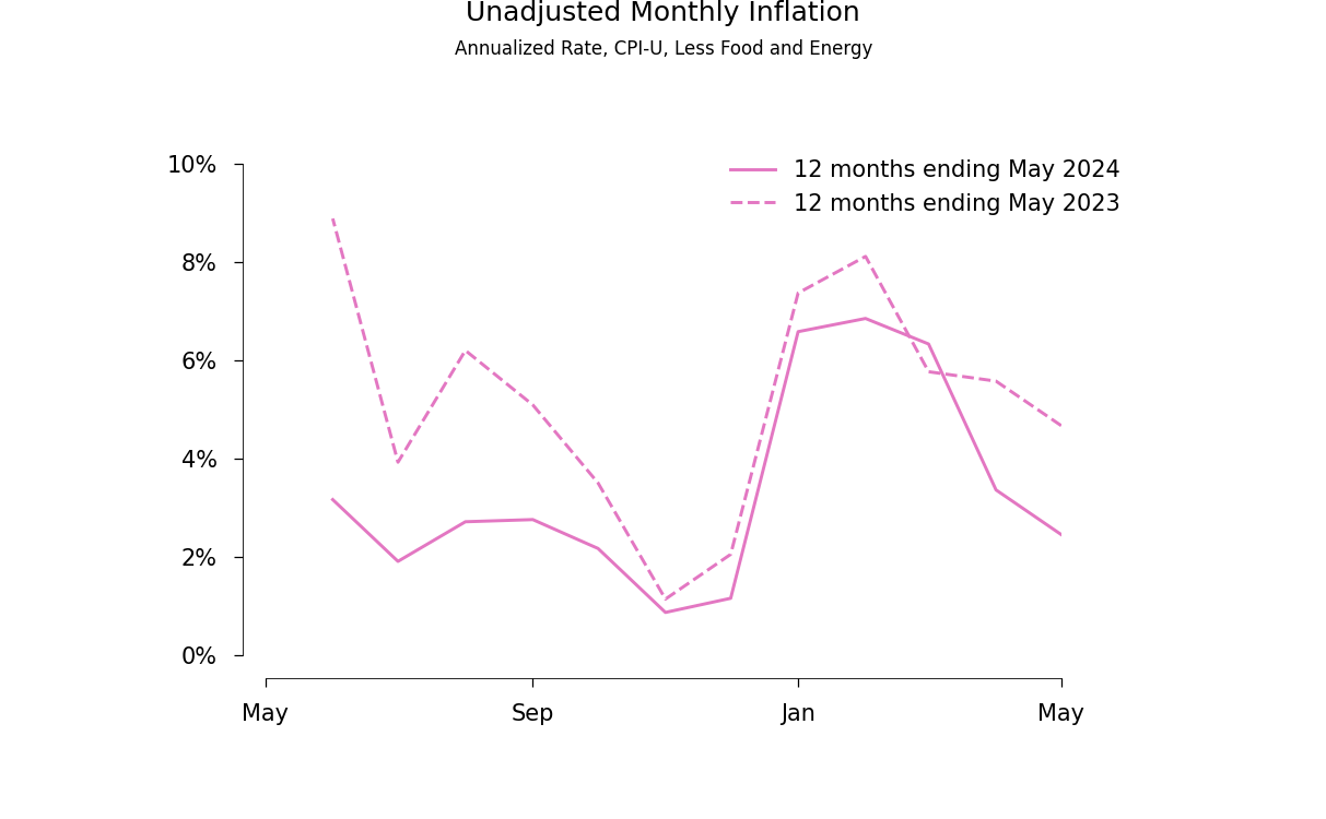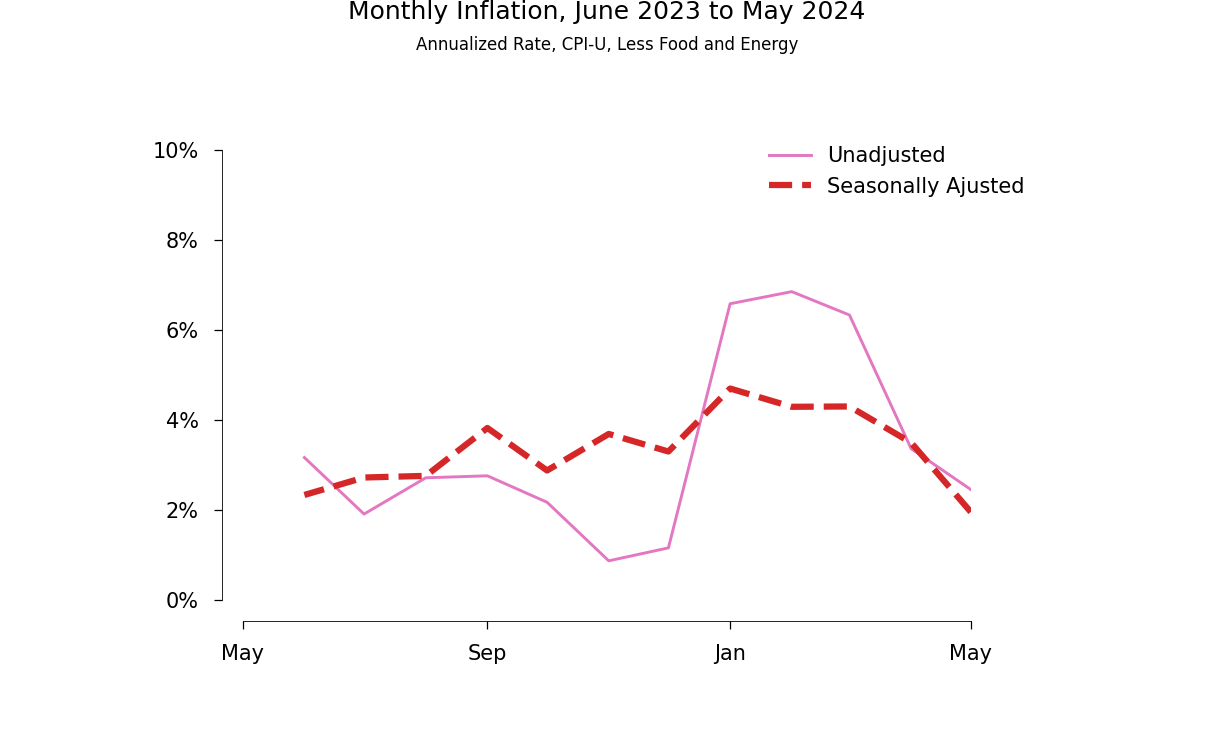 Right now, the seasonal variation that is left in the adjusted data for June 2023 to May 2024 is plainly evident in the next graph. The solid line is the raw monthly rate of change of prices. The thick broken line shows the same seasonally adjusted series that I displayed in the previous graph.